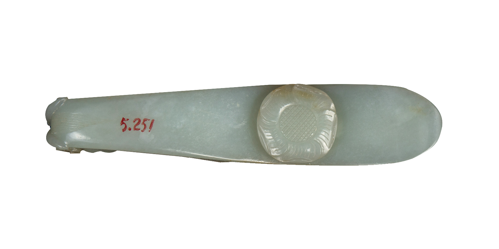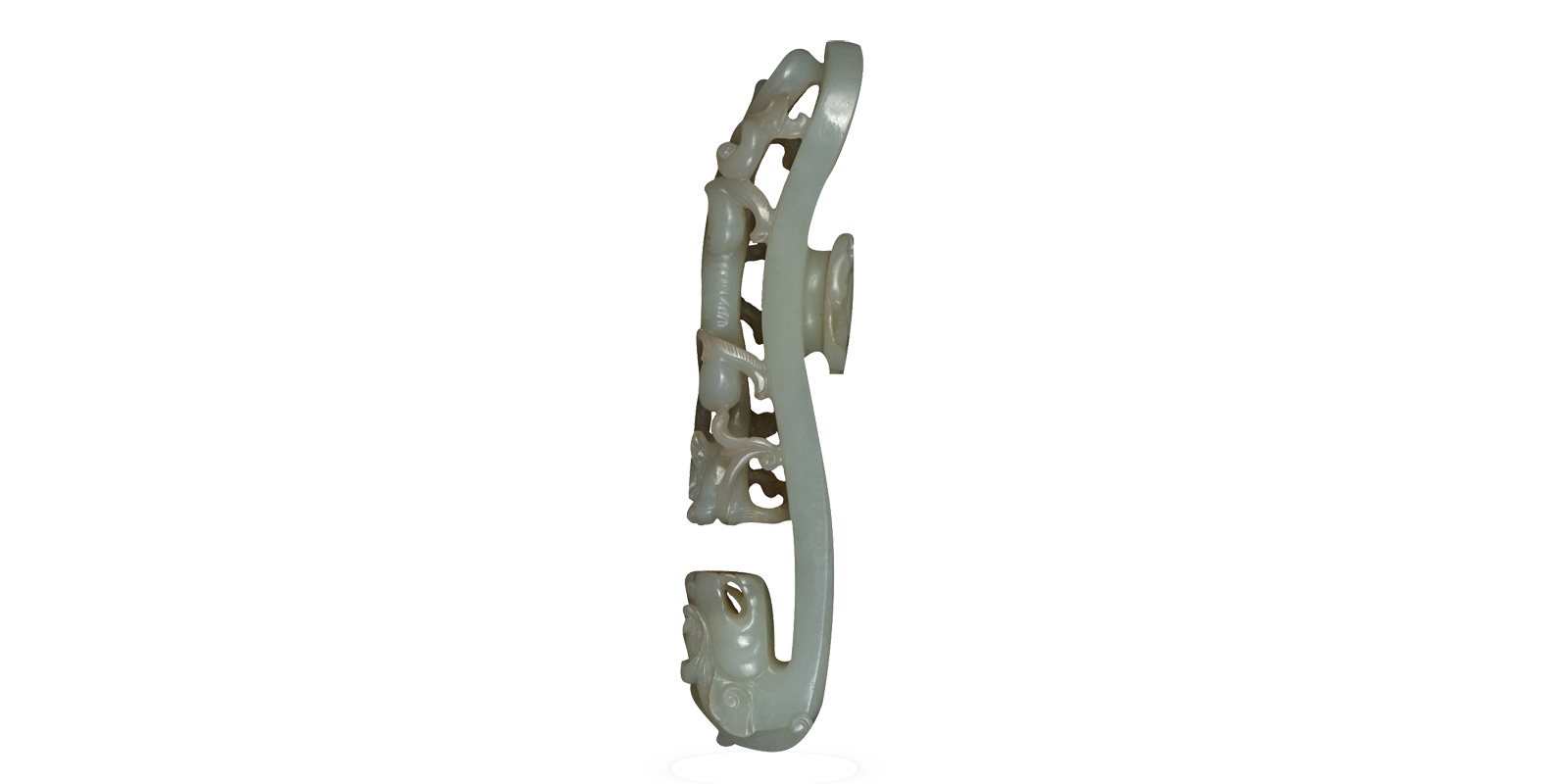 和田白玉。采用镌雕技法,器身呈回首龙状,龙体上镂刻一螭虎,下有一葵花形钮。