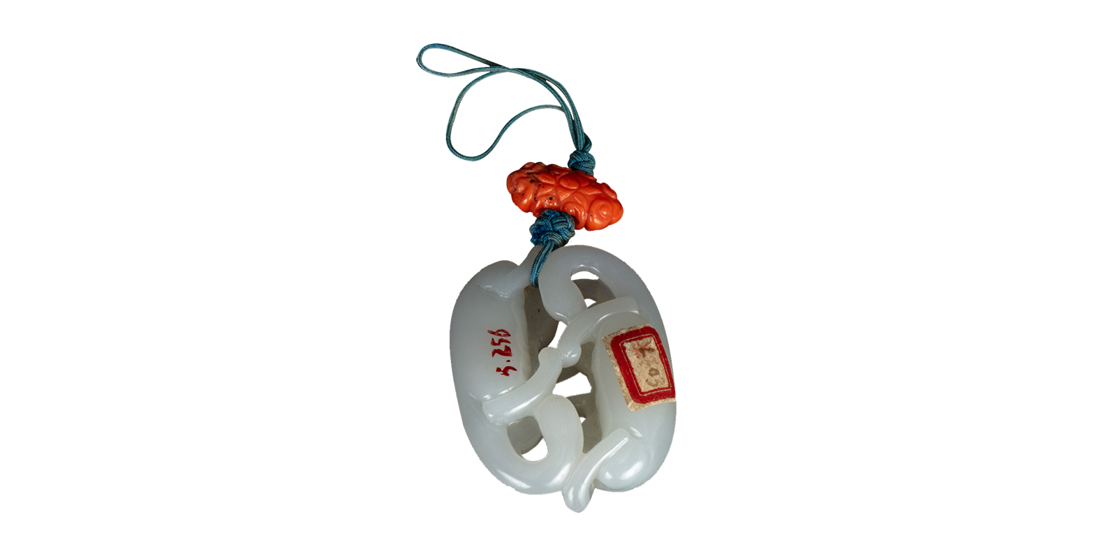 和田白玉,玉质光洁细腻。利用一块籽玉,雕琢一对首尾相接合欢的螭虎,刀法婉转,线条流畅,其上附有一雕花红珊瑚。螭虎双目圆睁,两耳竖立,身体丰满浑圆,四肢相拥,长尾自然下垂。
