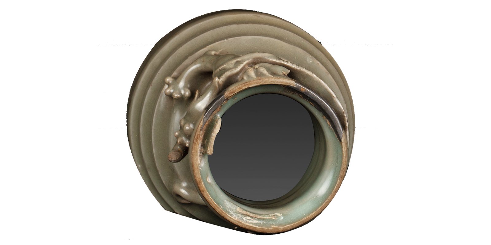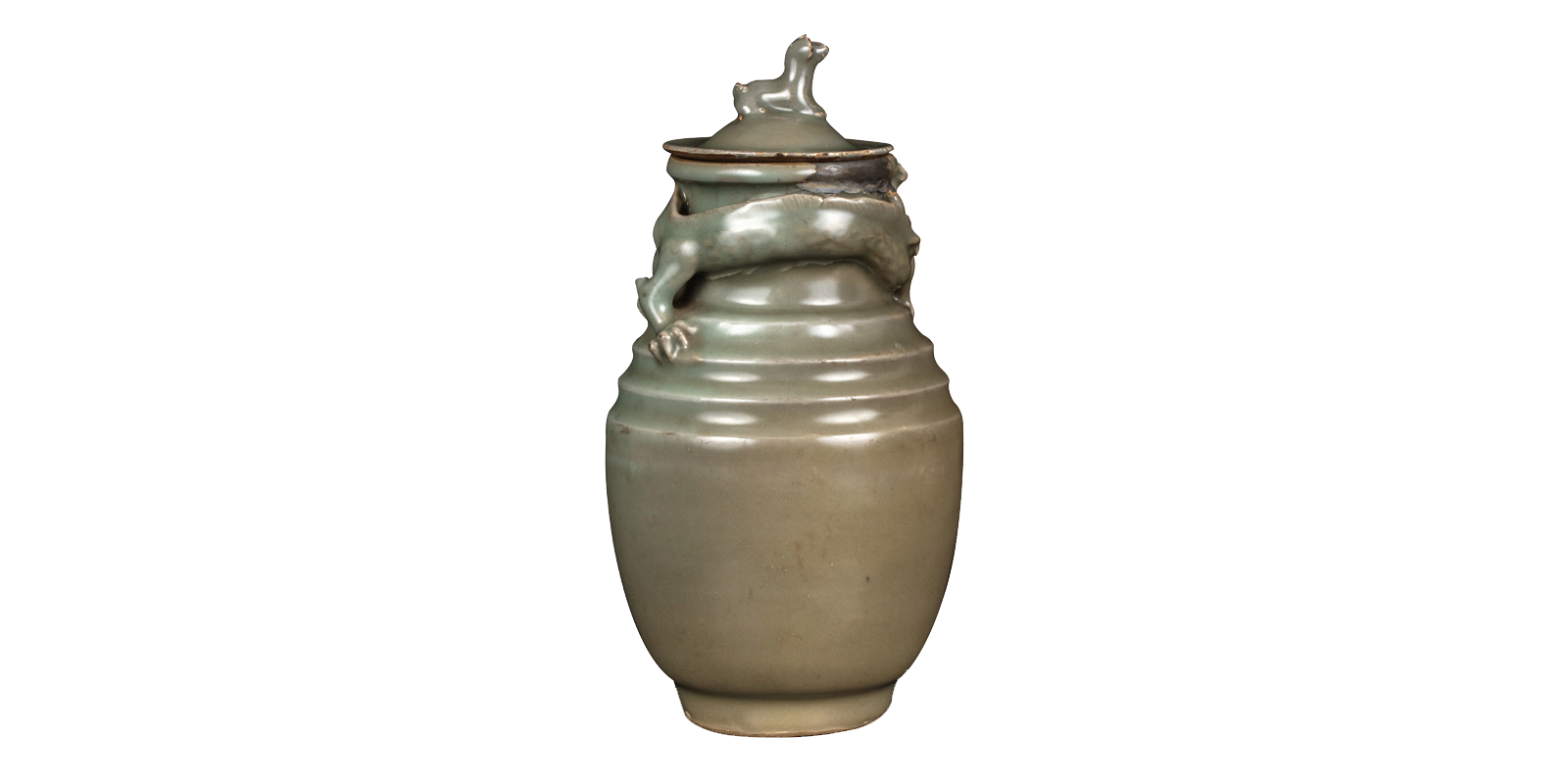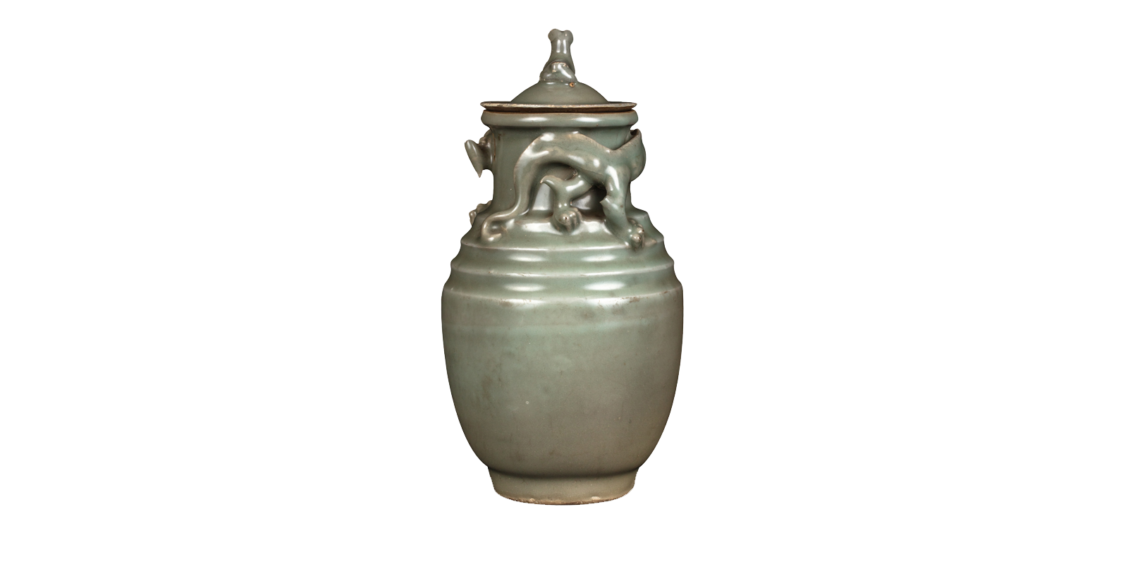 帽形盖,盖沿宽平,犬形钮。粗颈,颈上塑龙,龙体盘曲舞动。瓶肩呈多级塔式,鼓腹,圈足。器形与塑像的边角处转折明晰,瓶身与动物躯体圆润,造型准确而富于美感。通体施青灰色釉,釉色柔和幽雅,多层施釉,不透明,釉面光润细滑。