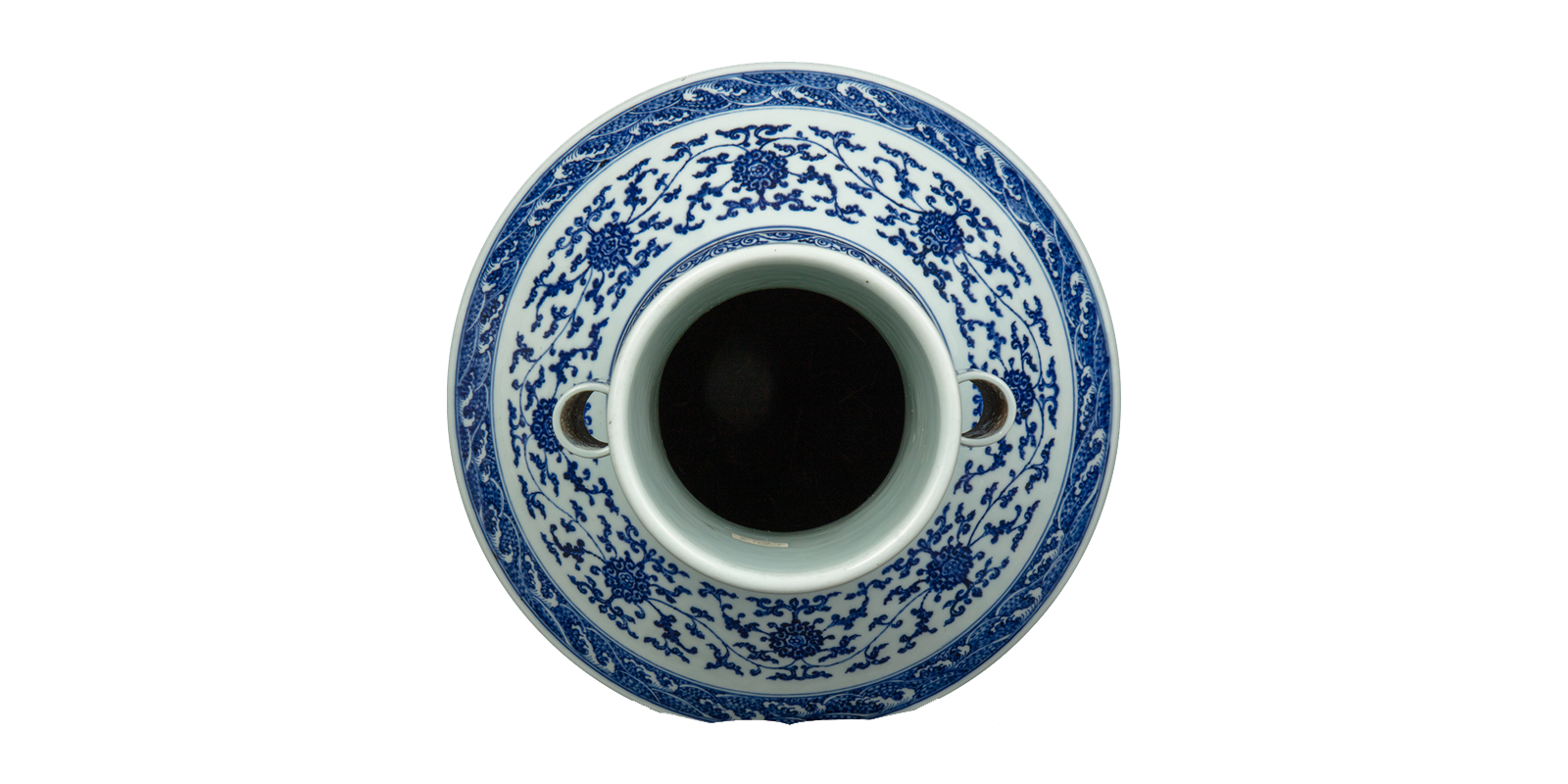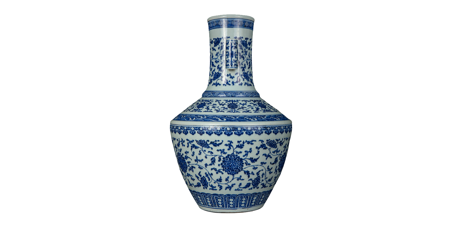 直口,长颈,颈上两贯耳,斜肩,半鼓腹,内圈足。釉面光洁润滑,通体青花装饰,青花色泽稳定,浑厚沉着。口沿饰回纹,颈及双耳绘缠枝莲纹,肩部间以卷草纹、缠枝莲纹、海水纹为饰,腹部绘如意云头纹、缠枝莲纹,腹底绘莲瓣纹。造型庄重典雅,古朴清丽。