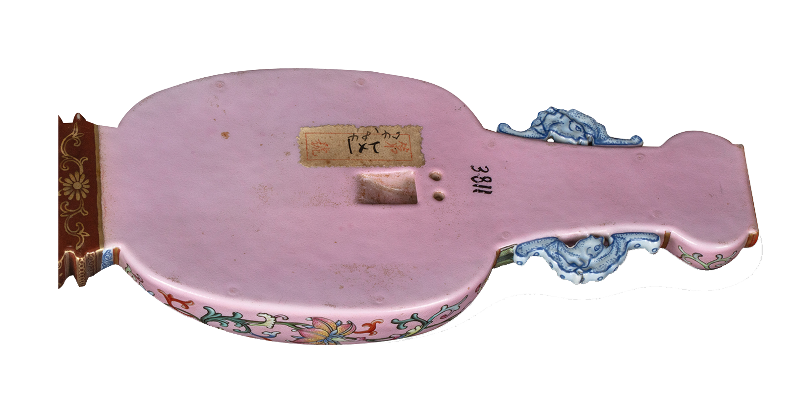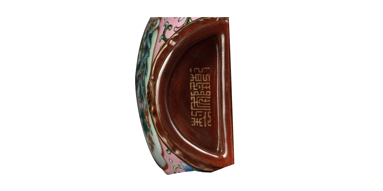 纵剖半器,呈扁平式,背有挂孔。蒜头口,直颈,颈附双螭耳,长圆腹,圈足。通体施粉色地釉,粉彩绘缠枝花卉,腹部开光绘山石花卉图,色彩浓艳。双耳及腹底加绘青花,底座为酱釉。底足内有褐色地描金横书“大清乾隆年制”篆款。