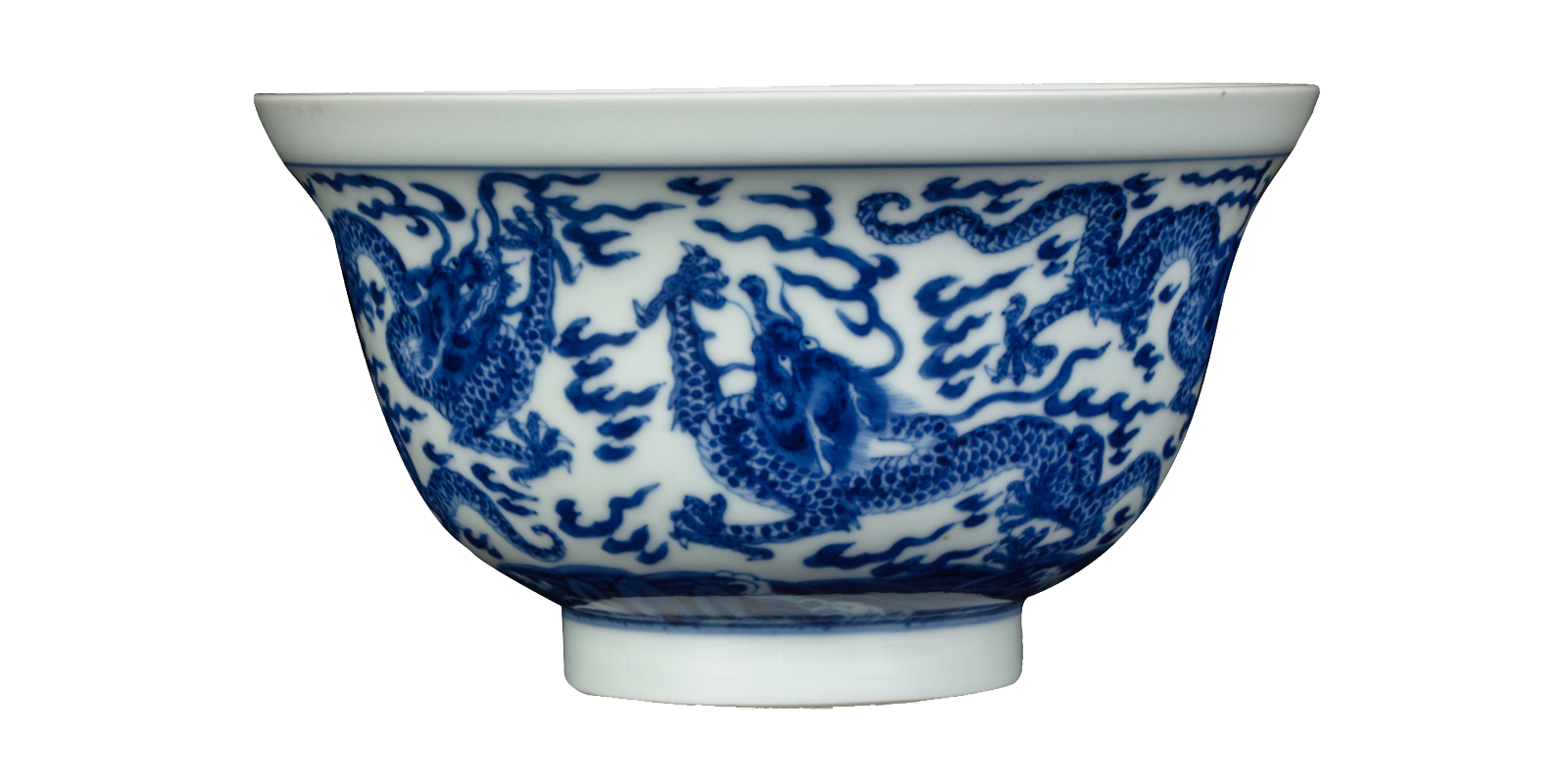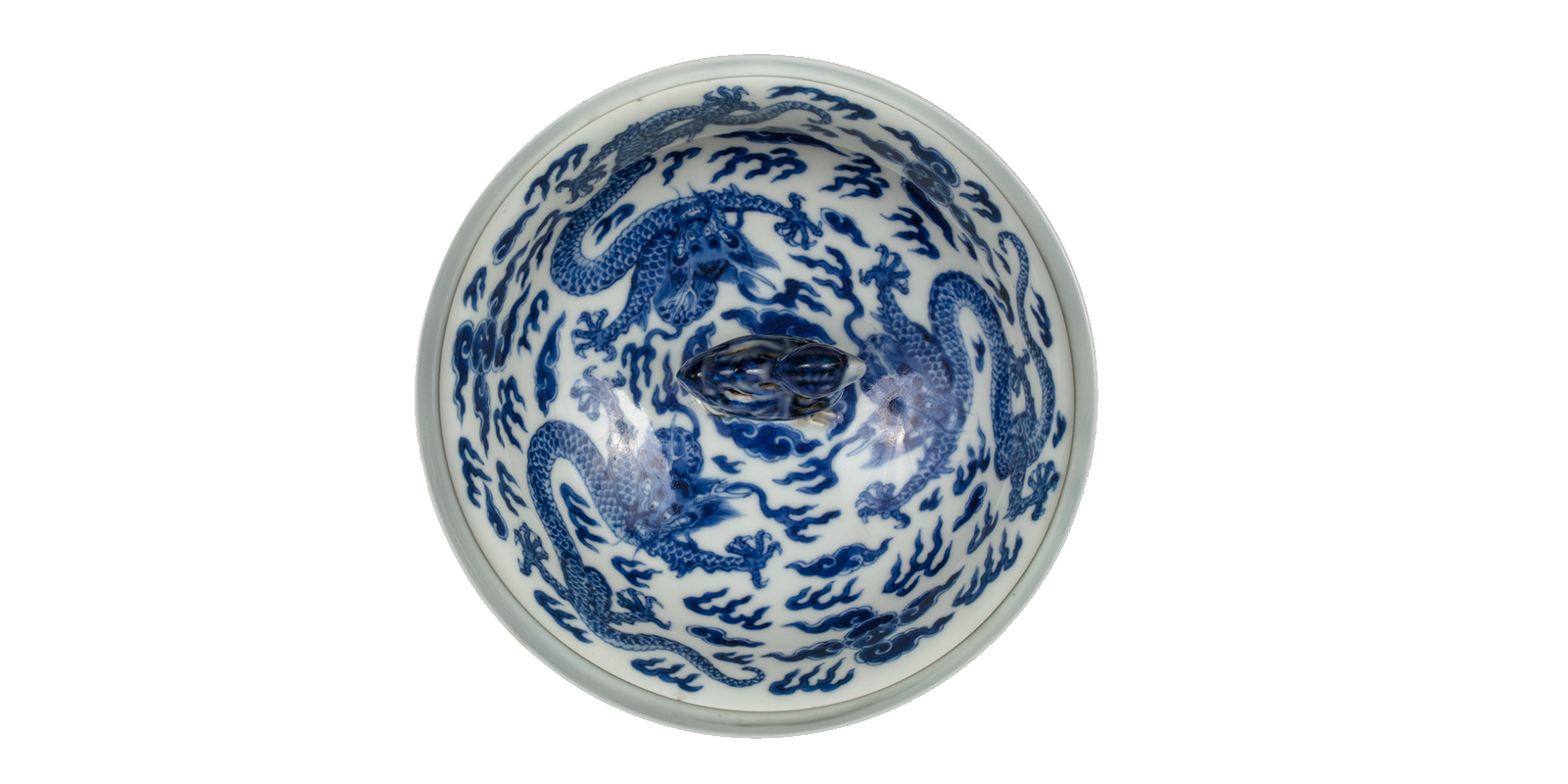 帽形盖,鸟形钮,折口,深腹,圈足,胎体轻薄,造型精巧秀逸。通体青花彩绘,盖面绘三龙,周围布满火珠云纹。腹部绘四奔龙纹,周遍布火珠云,腹底绘海水江芽纹,碗内底如意纹内书一“寿”字。底足内有青花双圈六字“大清康熙年制“楷书款。