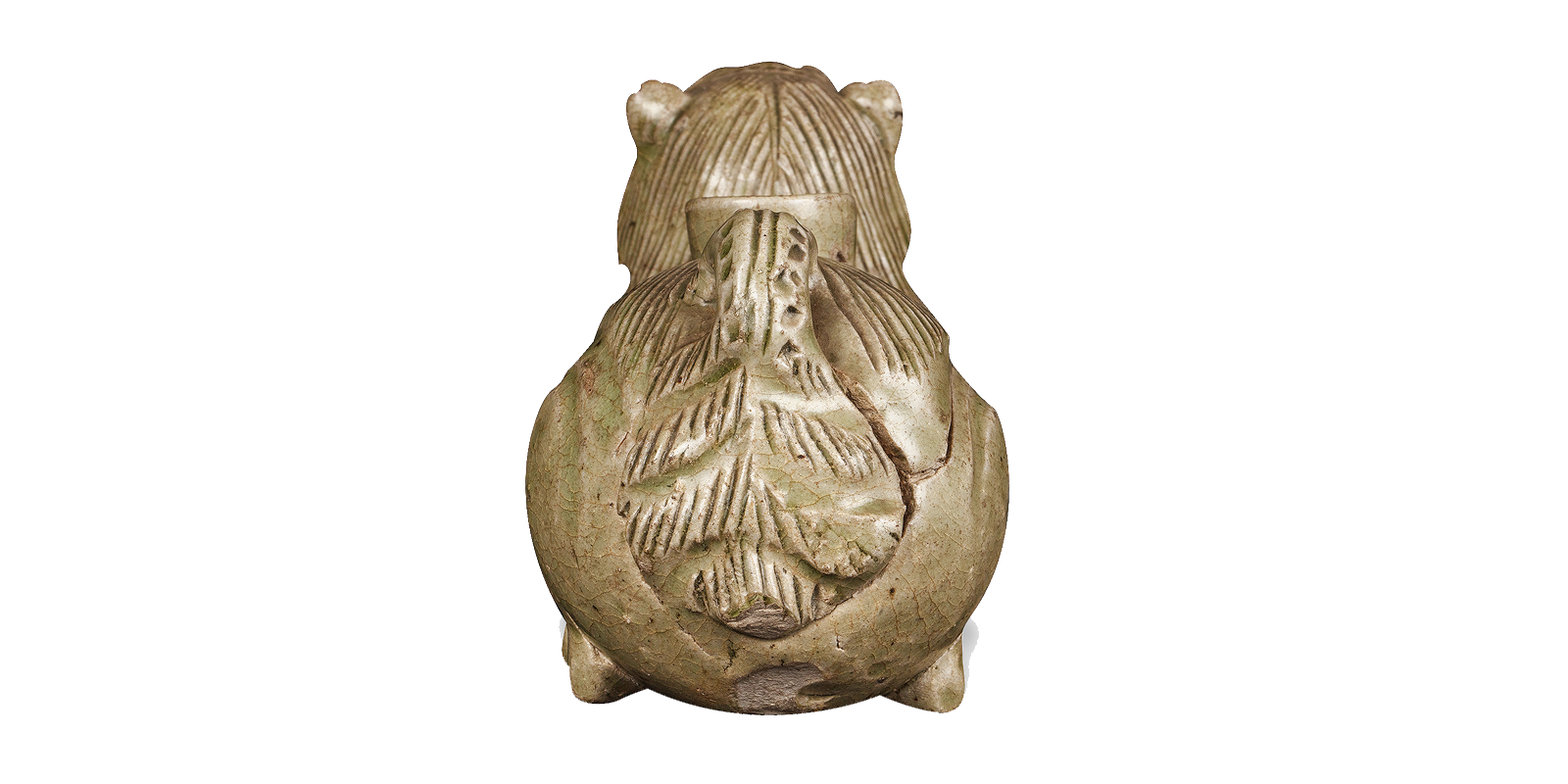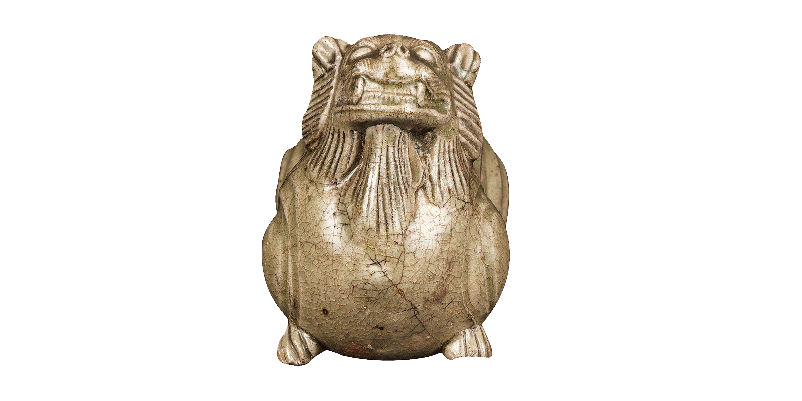 模印法成型,由两个半范印的坯片粘合而成。狮作卧伏状,小耳竖立,仰首龇牙,鬃毛下披至颈部,腹部皮毛纹路划刻清晰,臀部贴饰长尾,背部起圆柱状口,与腹腔通。通体青釉,施釉厚而均匀,釉色青绿。