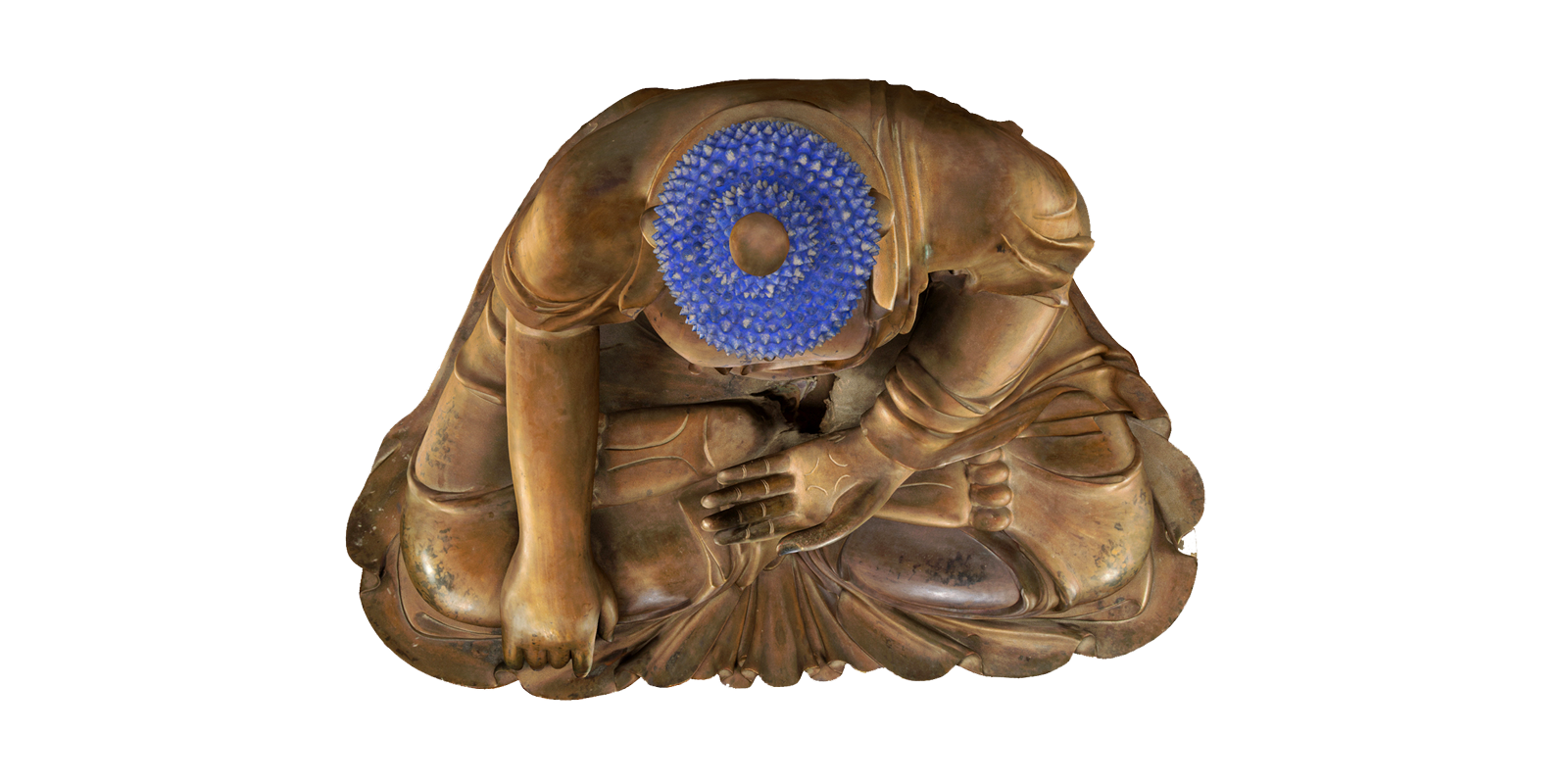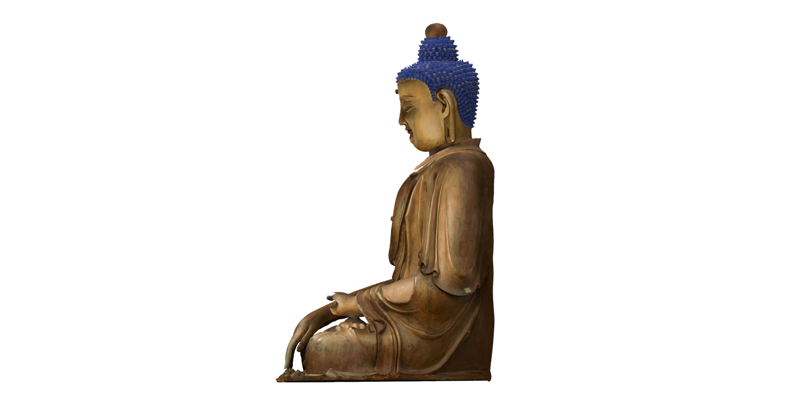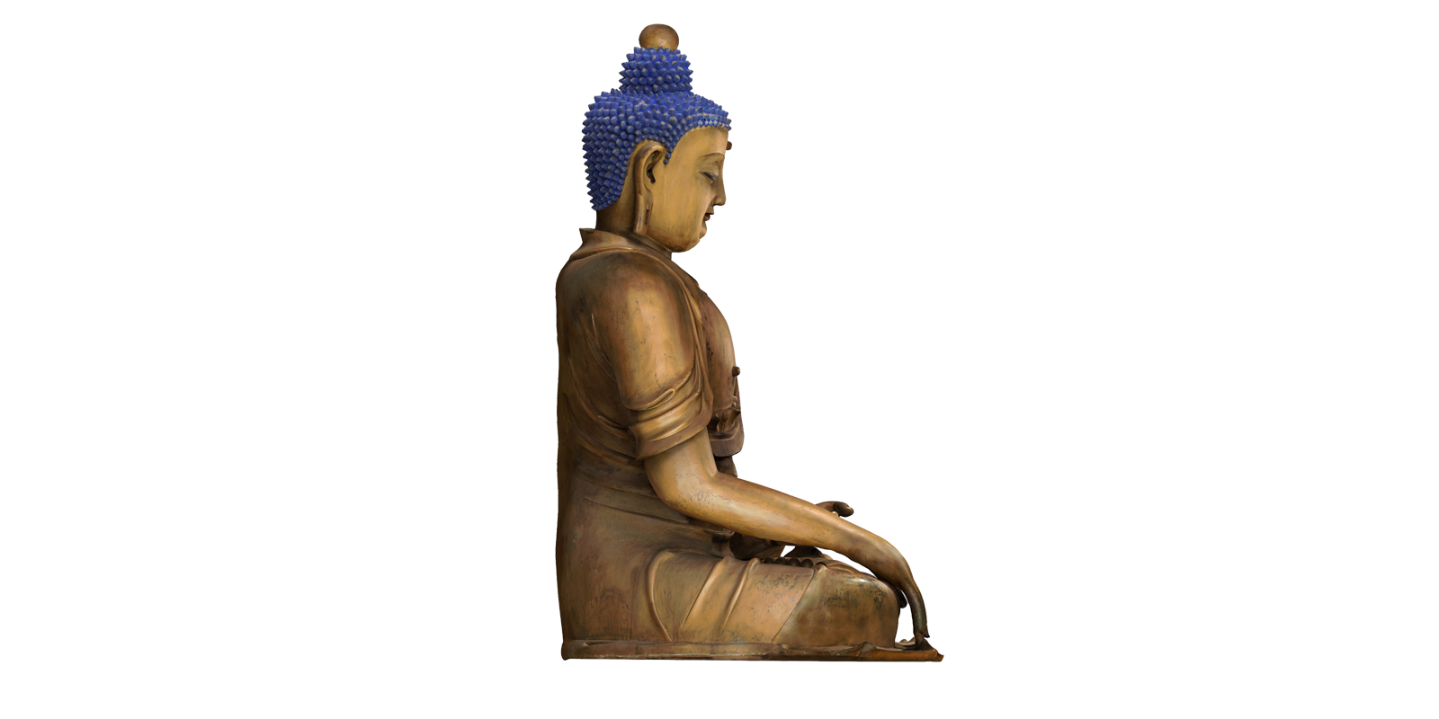 螺发,肉髻高耸,宝珠顶严。面相丰圆,大耳垂肩,额有白毫。眉目细长,直鼻小口。着半披式袈裟,衣纹流畅自然。左手结禅定印,右手施触地印,结跏趺端坐。
