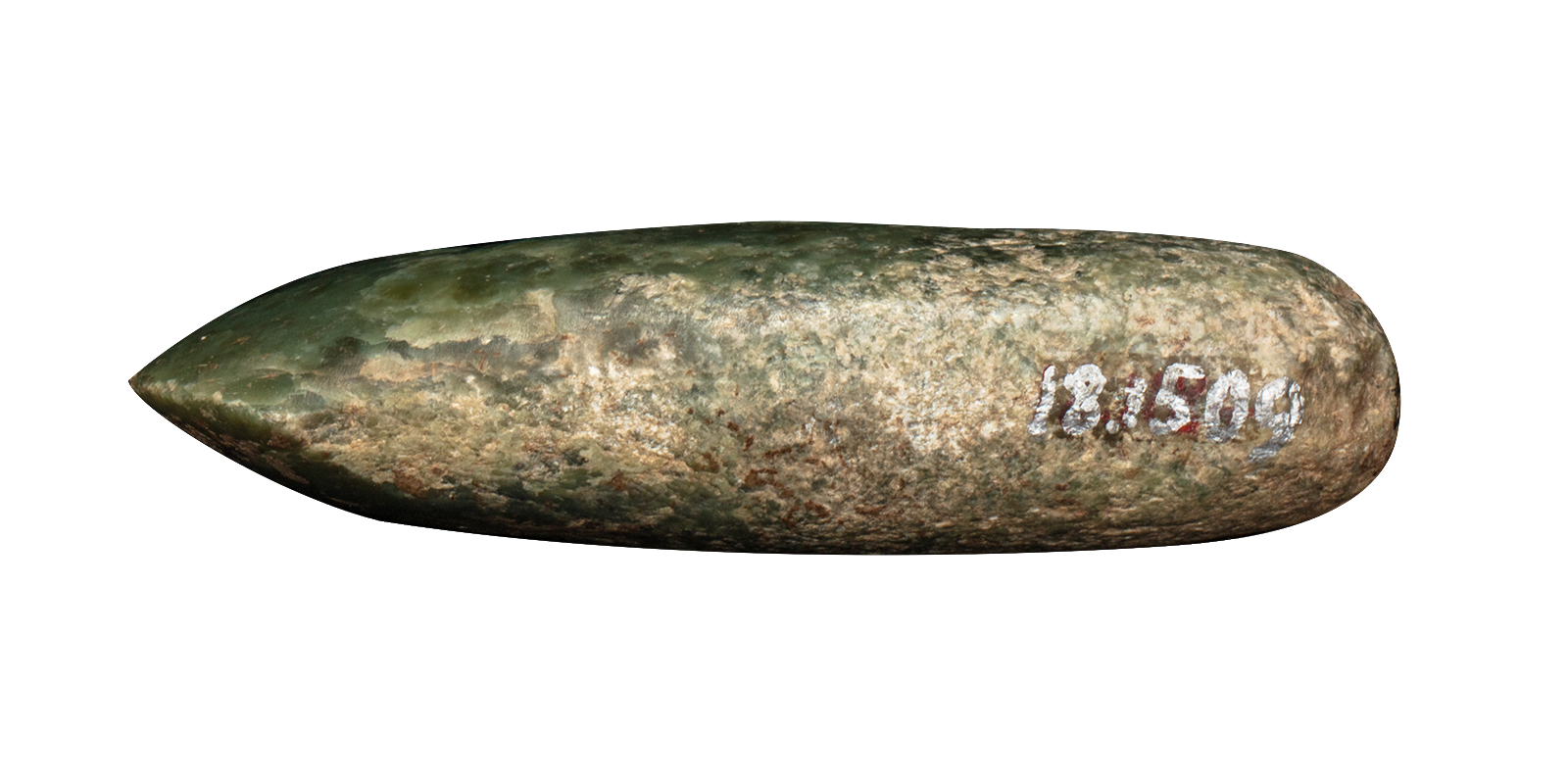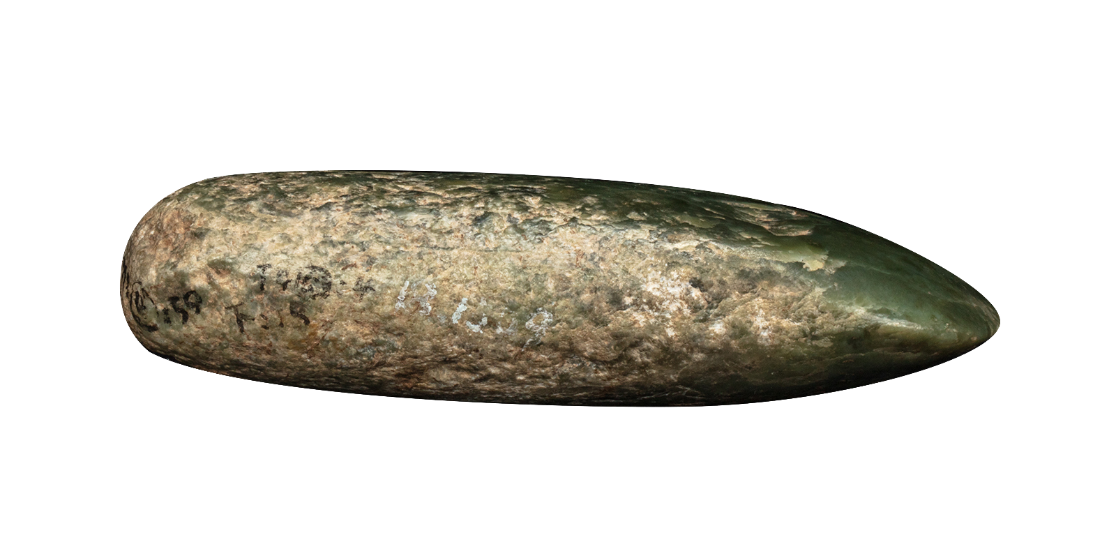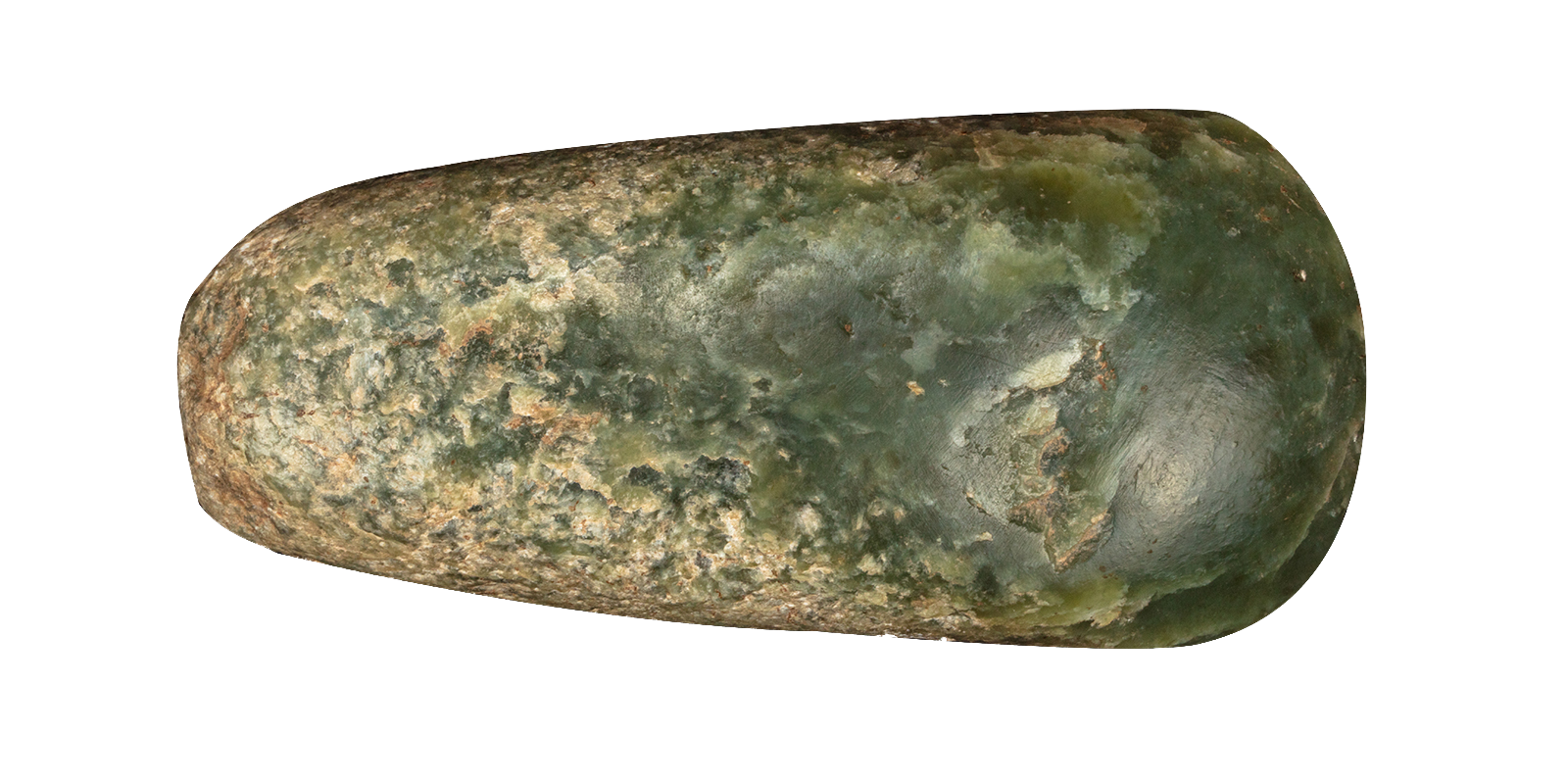 出土于长海县广鹿岛小珠山遗址,距今6500年,是迄今发现最早的玉器之一。青玉制成的生产工具,局部有褐色浸斑和明显的使用痕迹,可证明早期玉器是实用的生产工具,也是人类早期开发岫岩玉的例证。