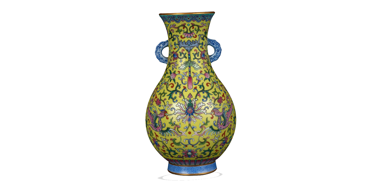 嘉庆款黄地粉彩双凤衔花纹 双耳瓶